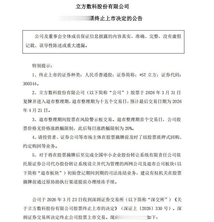 3月23日晚间,*ST立方公告称,公司于当日收到深圳证券交游所(以下简称“深交所”)对于公司股票远隔上市的决定。凭据公告,*ST立方股票将于3月31日复牌并插足退市整理期,退市整理期为十五个交游日,瞻望终末交游日为4月21日,尔后将完成摘牌并远隔上市。