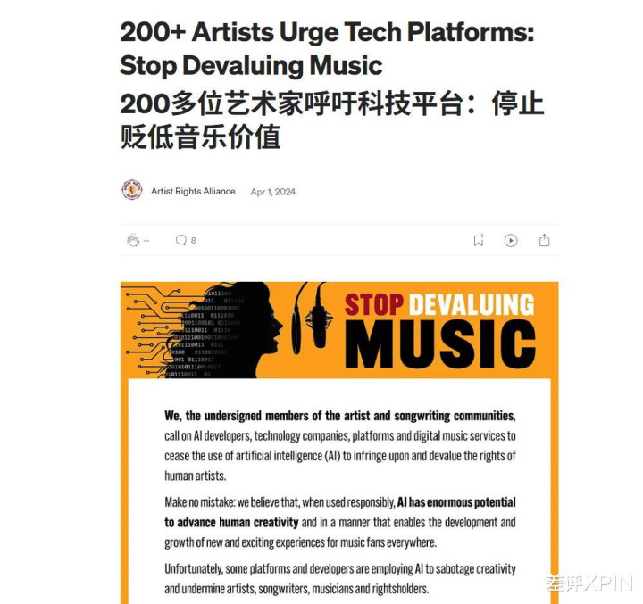 其实不仅仅国内的底层从业者在哀嚎,早前也少见百位西洋有名音乐东说念主发布联名信,抗议 AI 对音乐产业的无底线攫取。