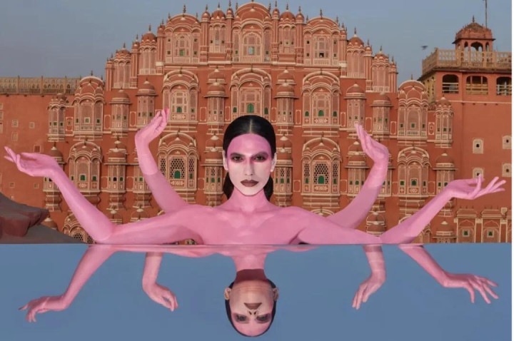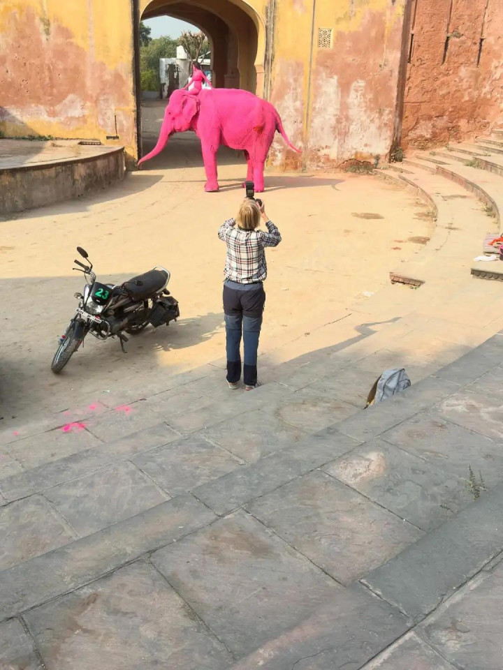 她的逻辑其实挺顺的:大象是拉贾斯坦邦的记号,粉色是斋浦尔的灵魂,那把它们拼在一齐,不等于一张随机片吗?
