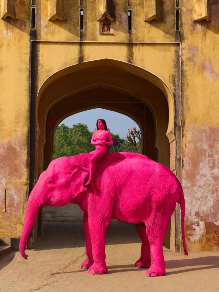 一个俄罗斯照相师跑到印度,把一头大象涂成了粉色。